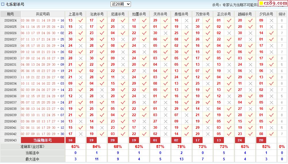 > 七乐彩043期 澳客专家杀号码预测推荐